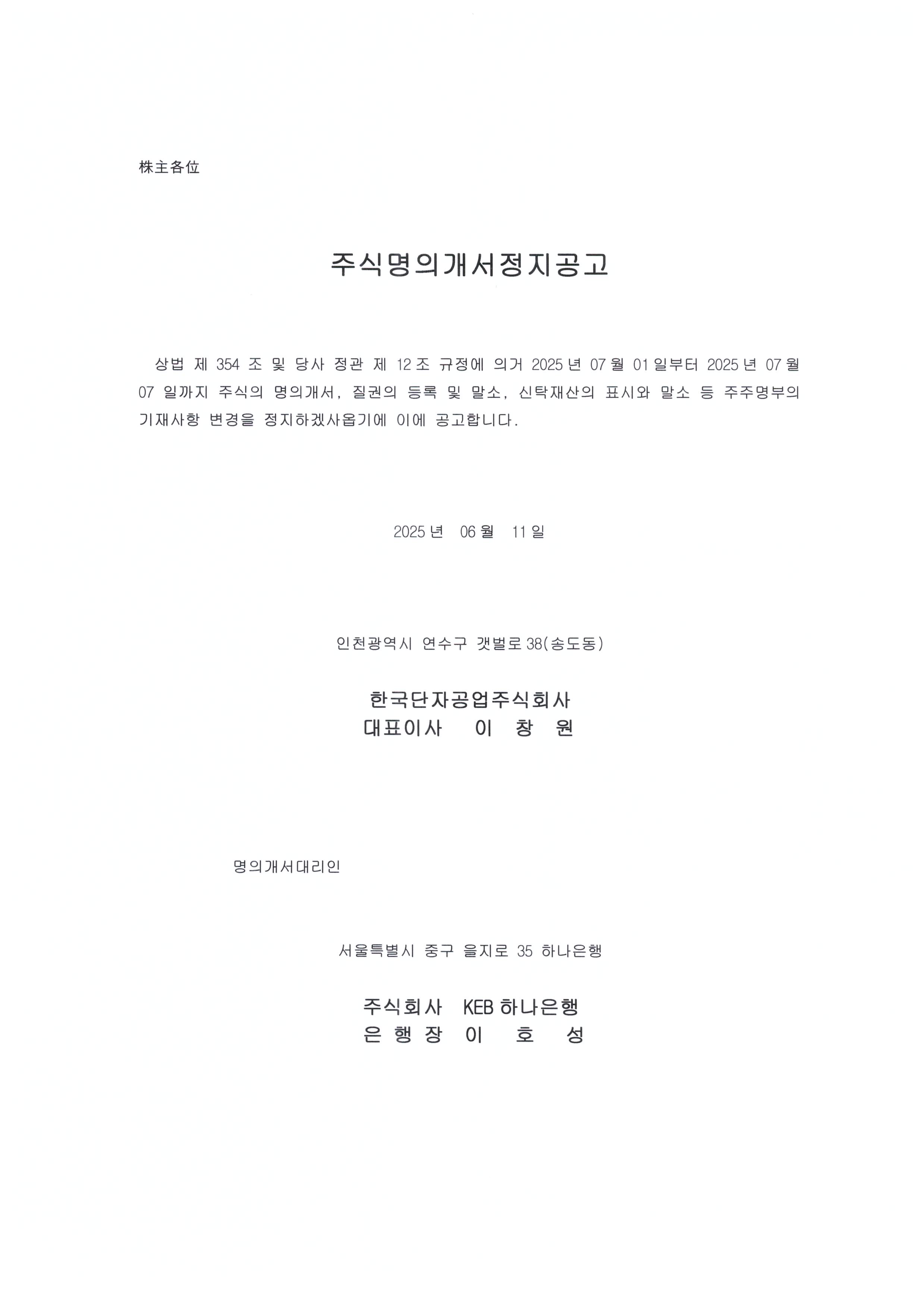 중간배당을위한 주주명부폐쇄(기준일)결정 공고